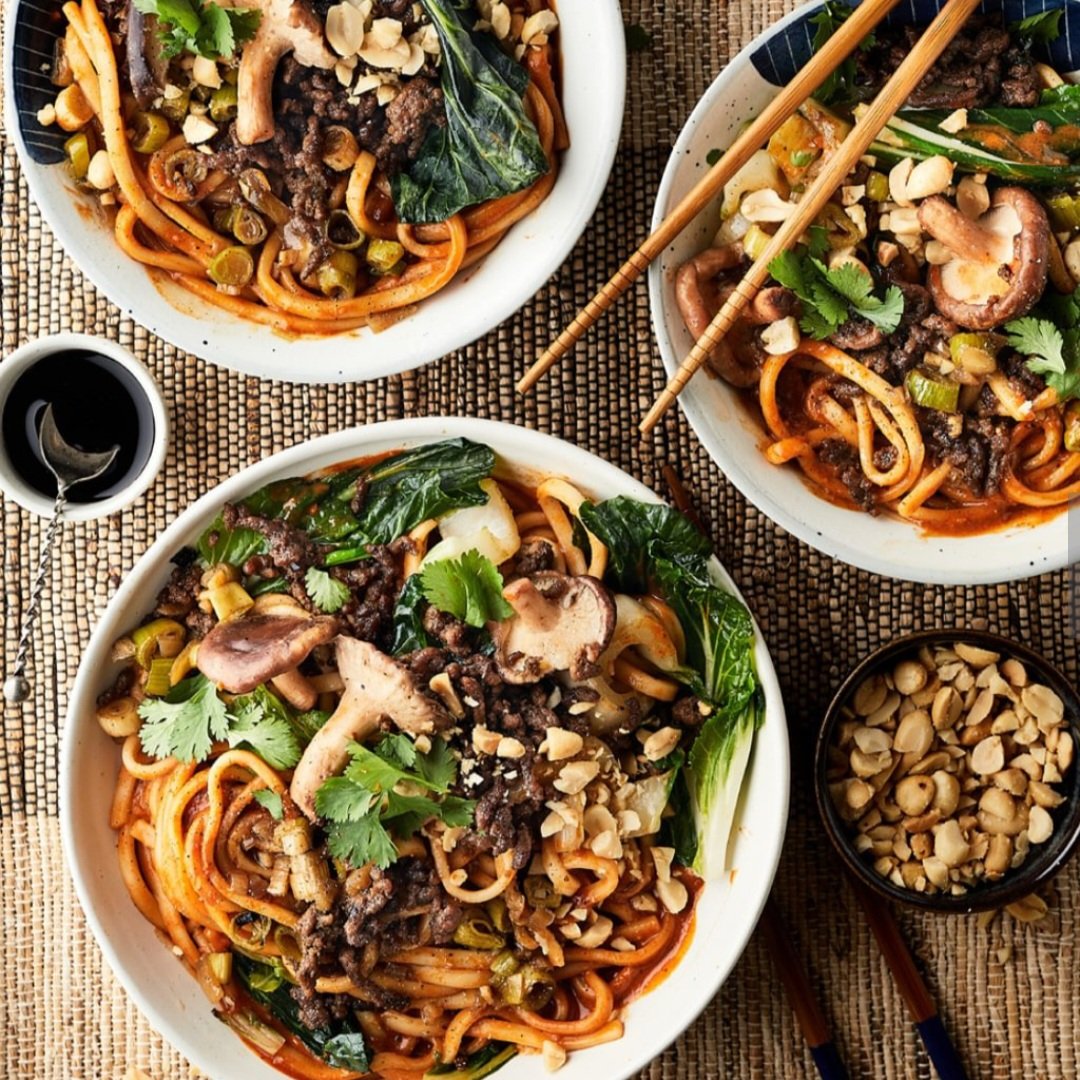 - Verhit een scheutje olie in de koekenpan en bak de ui, de knoflook en de lente-ui 2-3 minuten op laag vuur. Zet het vuur hoger en voeg de shiitake en de paksoi toe en bak kort mee. Schep de gochujang-pindasaus, het water en de gekookte noedels bij de groenten en schep 1-2 minuten om. Verdeel de noedels over de borden en bestrooi met het knapperige gehakt. Bestrooi met de fijngehakte pinda’s en de koriander.