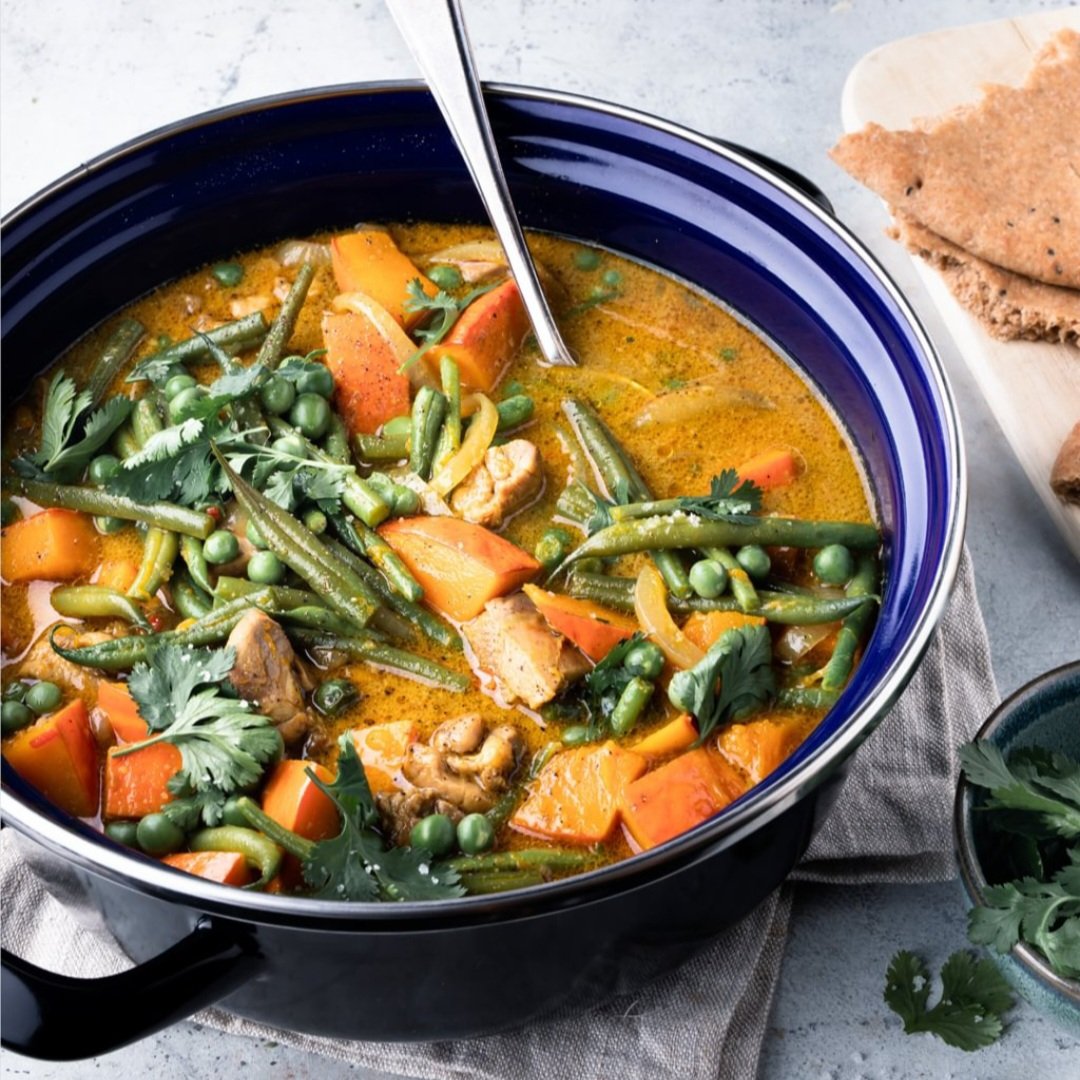 • Verhit een scheutje zonnebloemolie in een braadpan en fruit de uiringen met de rode peper 2-3 minuten. Roer de curry-madraskruiden erdoor en bak ca. 1 minuut mee. Voeg de stukjes pompoen en de kip toe en bak in 5-6 minuten rondom bruin.