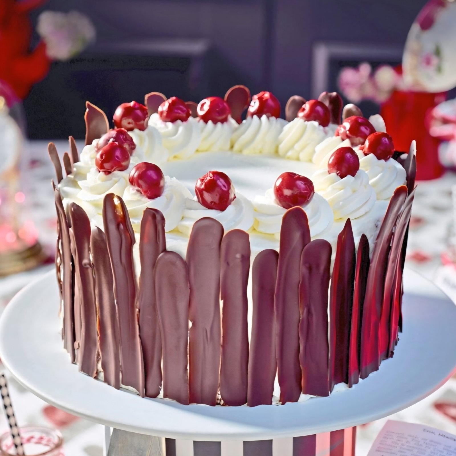 • Klop 200 ml slagroom stijf. Bestrijk de taart rondom met ⅔ van de slagroom. Zet de chocoladestrookjes tegen de rand van de taart omhoog. Spuit de rest van de slagroom in toefjes op de taart. Versier met de rest van de kersen.