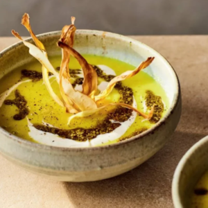 Paddenstoelen-pompoensoep met pistache-knoflooksalsa